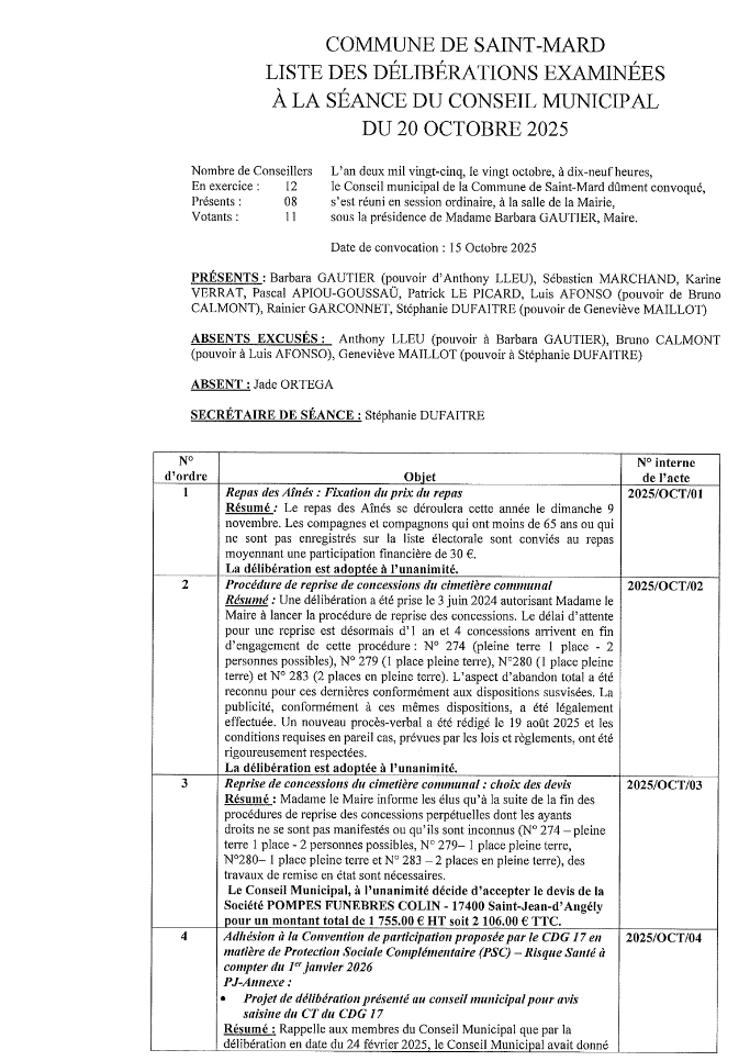 Veuillez trouver ci-dessous la liste des délibérations examinées à la séance du Conseil municipal du 20 octobre 2025.
