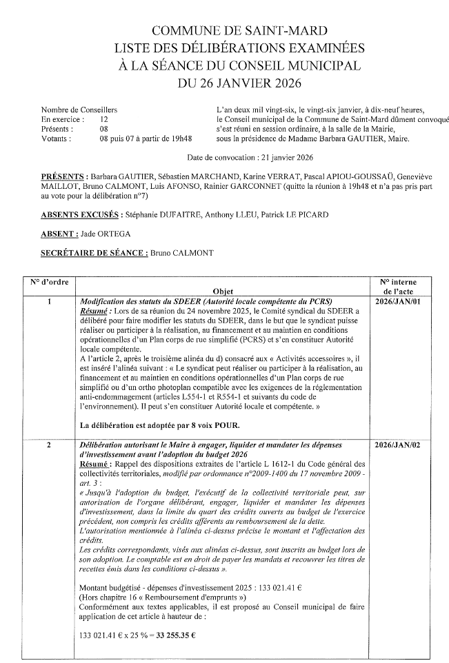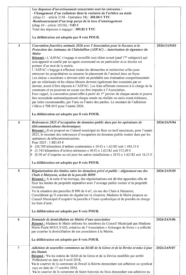 Veuillez trouver ci-dessous la liste des délibérations examinées à la séance du Conseil municipal du 26 janvier 2026